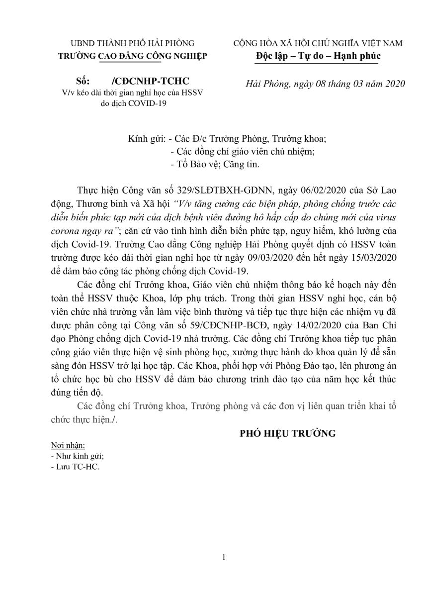 THÔNG BÁO V/v KÉO DÀI THỜI GIAN NGHỈ HỌC CỦA HSSV TỪ 09/03 ĐẾN HẾT 15/03/2020