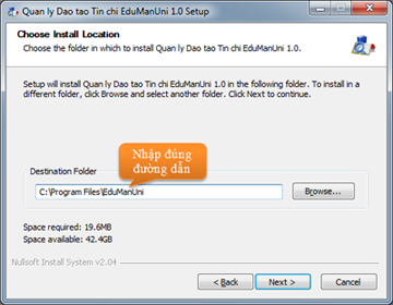 Bước 2: Chạy file Setup_EduManUni_10.exe để cài đặt. Quá trình cài đặt bình thường nhưng lưu ý tại cửa sổ chọn thư mục cài đặt nếu thư mục mặc định không phải là C:\Program Files\EduManUni thì nhắp nút Browse để chọn thư mục Program Files trong ổ đĩa C.