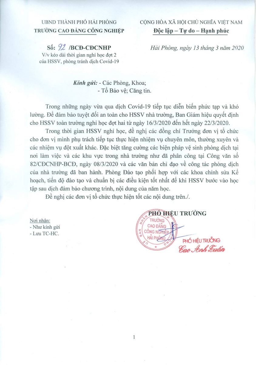 THÔNG BÁO V/v KÉO DÀI THỜI GIAN NGHỈ HỌC CỦA HSSV TỪ 16/03 ĐẾN HẾT 22/03/2020