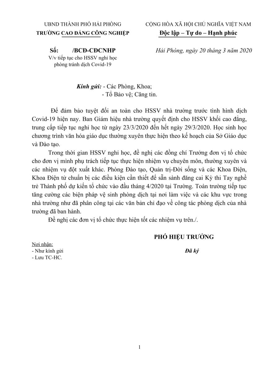 THÔNG BÁO V/v KÉO DÀI THỜI GIAN NGHỈ HỌC CỦA HSSV TỪ 23/03 ĐẾN HẾT 29/03/2020