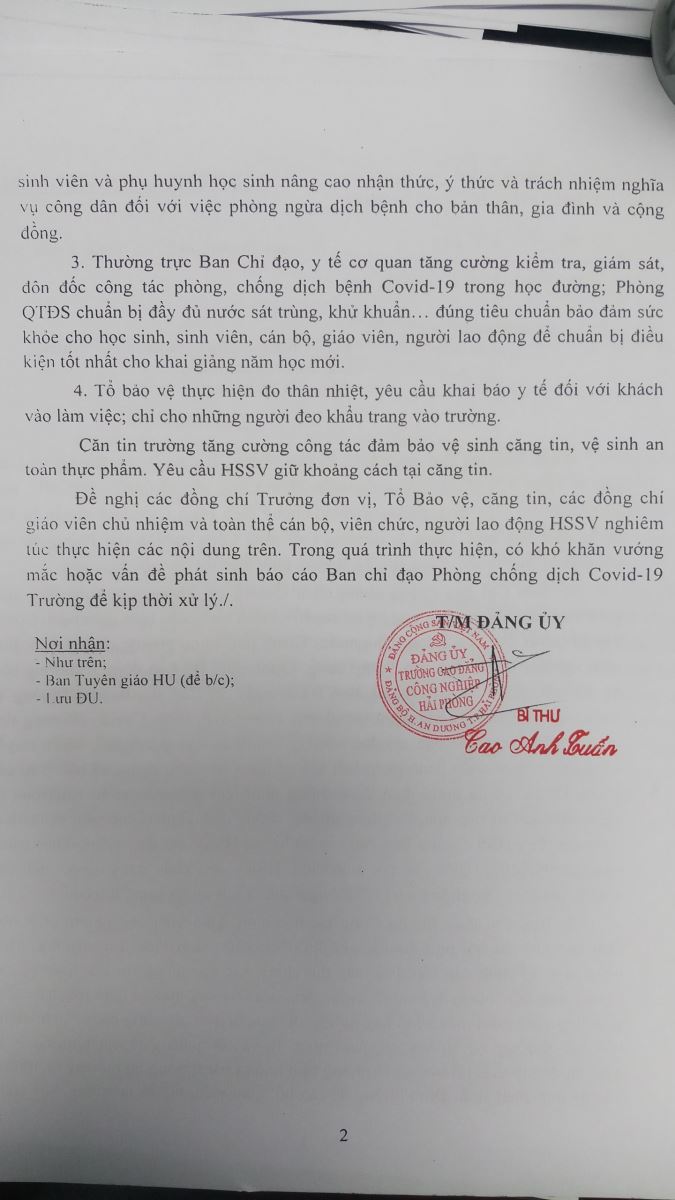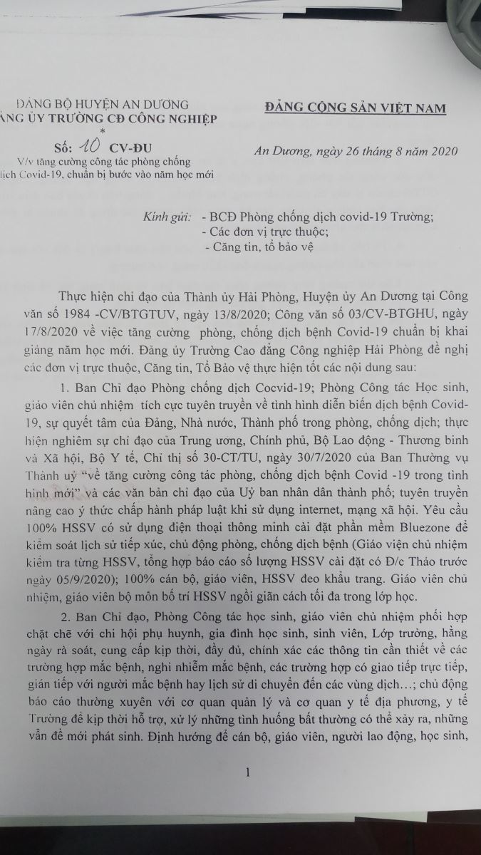 Thực hiện sự chỉ đạo của Thành ủy Hải Phòng, Huyện ủy An Dương tại Công văn số 1984-CV/BTGTUV, ngày 13/8/2020; Công văn số 03/CV-BTGHU, ngày 17/8/2020 về việc tăng cường phòng, chống dịch bệnh Covid-19 chuẩn bị cho Khai giảng năm học mới. Đảng ủy trường Cao đẳng Công nghiệp Hải Phòng, đề nghị thực hiện tốt các nội dung sau: