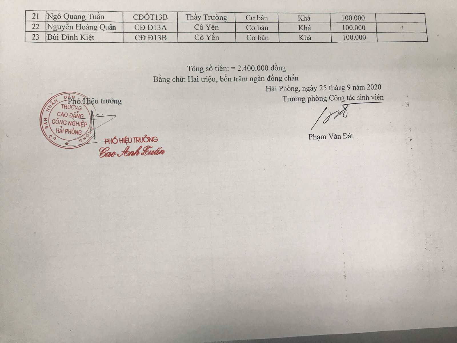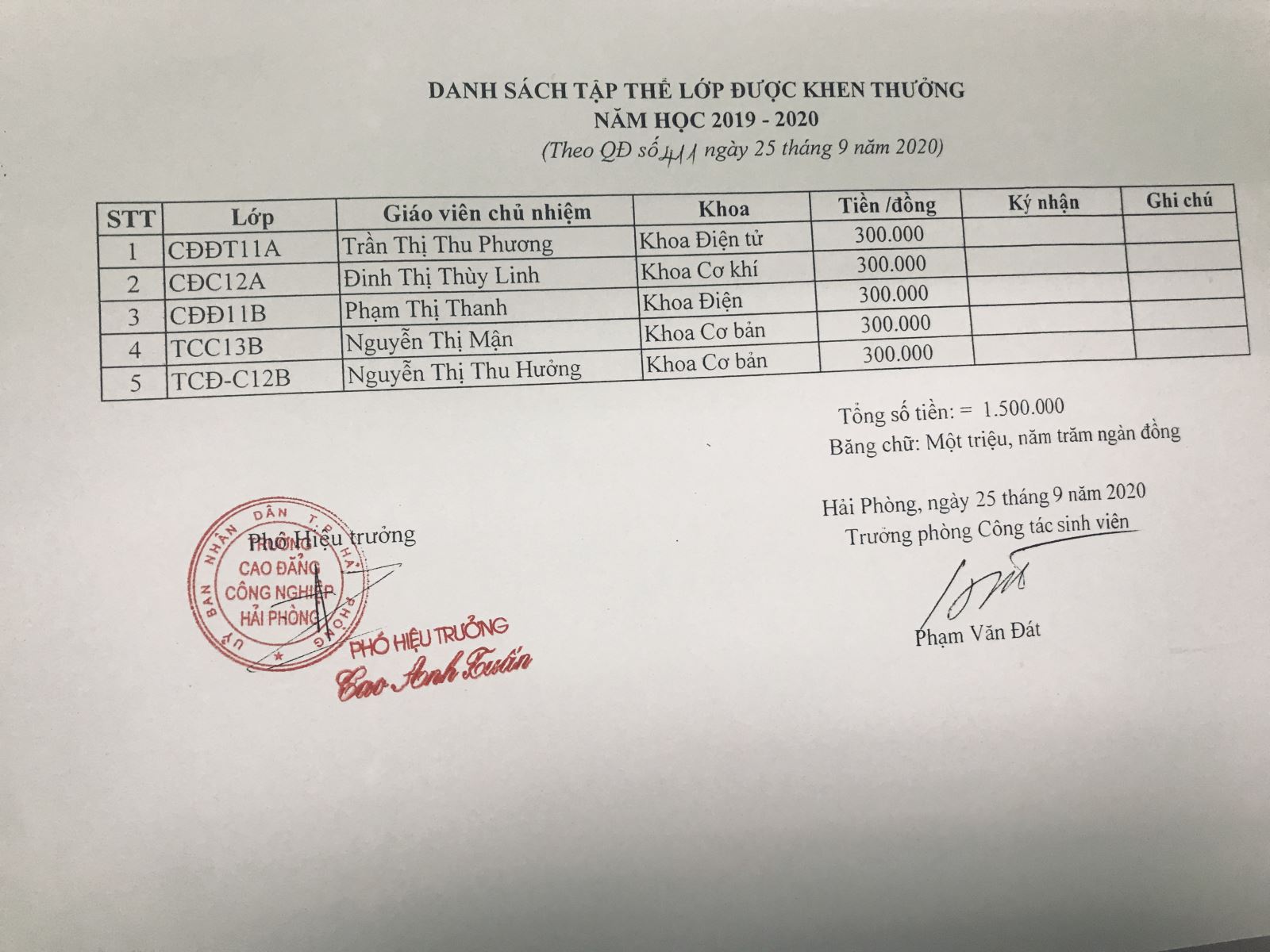 Theo Quyết định số 411/QĐ_CĐCN, ngày 25/9/2020 của phó Hiệu trưởng phụ trách trường Cao đẳng Công nghiệp Hải Phòng, về Thi đua khen thưởng năm học 2019-2020. Hội đồng Thi đua khen thưởng nhà trường đã họp ngày 24/9/2020, ra quyết định khen thưởng Tập thể lớp và Học sinh, sinh viên đã đạt thành tích cao trong học tập, rèn luyện.