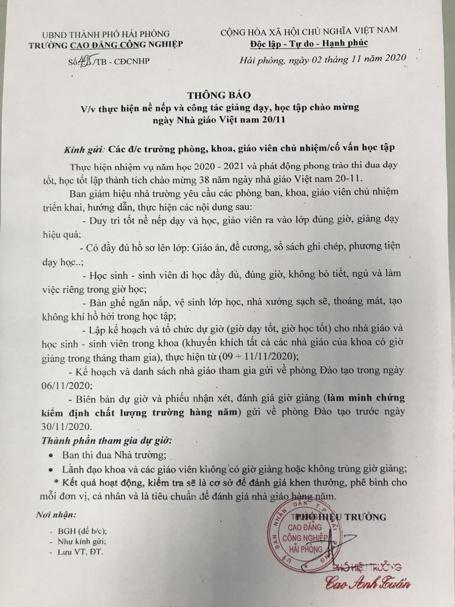 Ban giám hiệu nhà trường yêu cầu các phòng, ban, khoa, giáo viên chủ nhiệm triển khai, hướng dẫn thực hiện các nội dung: