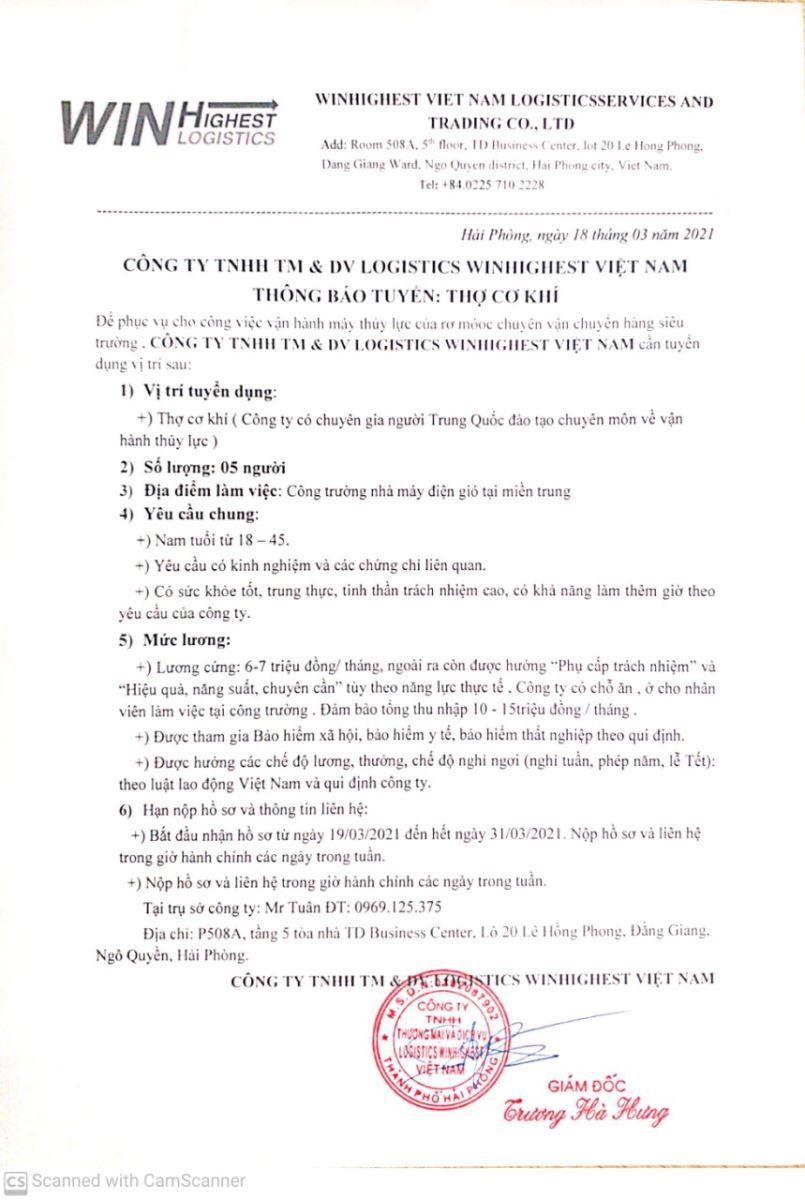 CÔNG TY TNHH TM&DV LOGISTICS VIỆT NAM TUYỂN THỢ CƠ KHÍ