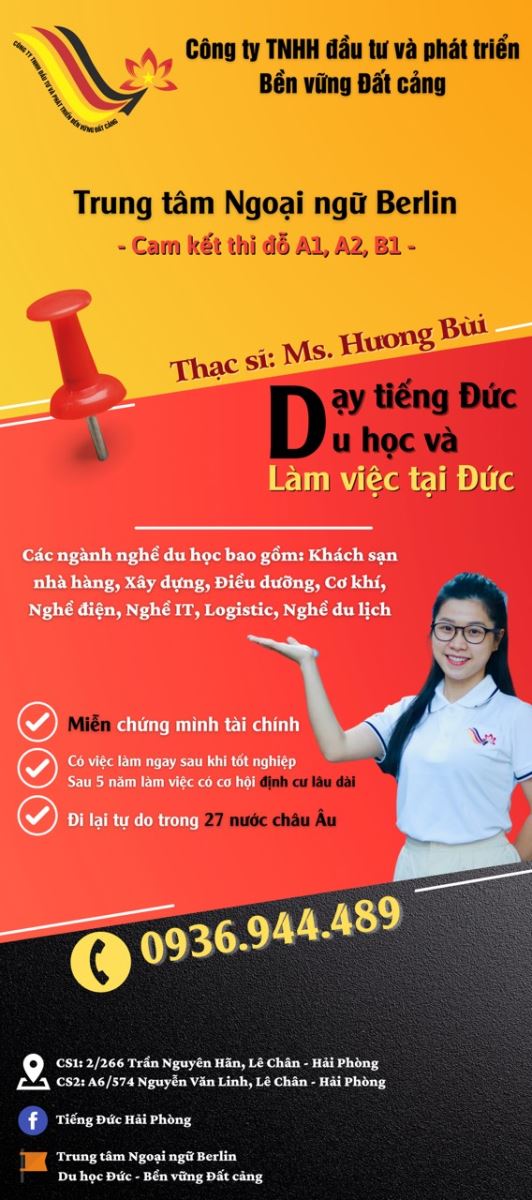Để giúp HSSV có nhiều cơ hội tìm kiếm việc làm sau khi tốt nghiệp. Nhà trường kết hợp với công ty Đầu tư và Phát triển bền vững Đất Cảng-Trung tâm Ngoại ngữ BERLIN- Thông báo chương trình làm việc và học tiếng Đức tại trường cho tất cả các em HSSV đang học, có nhu cầu đăng ký tại phòng Đào tạo trường CĐCN Hải Phòng.