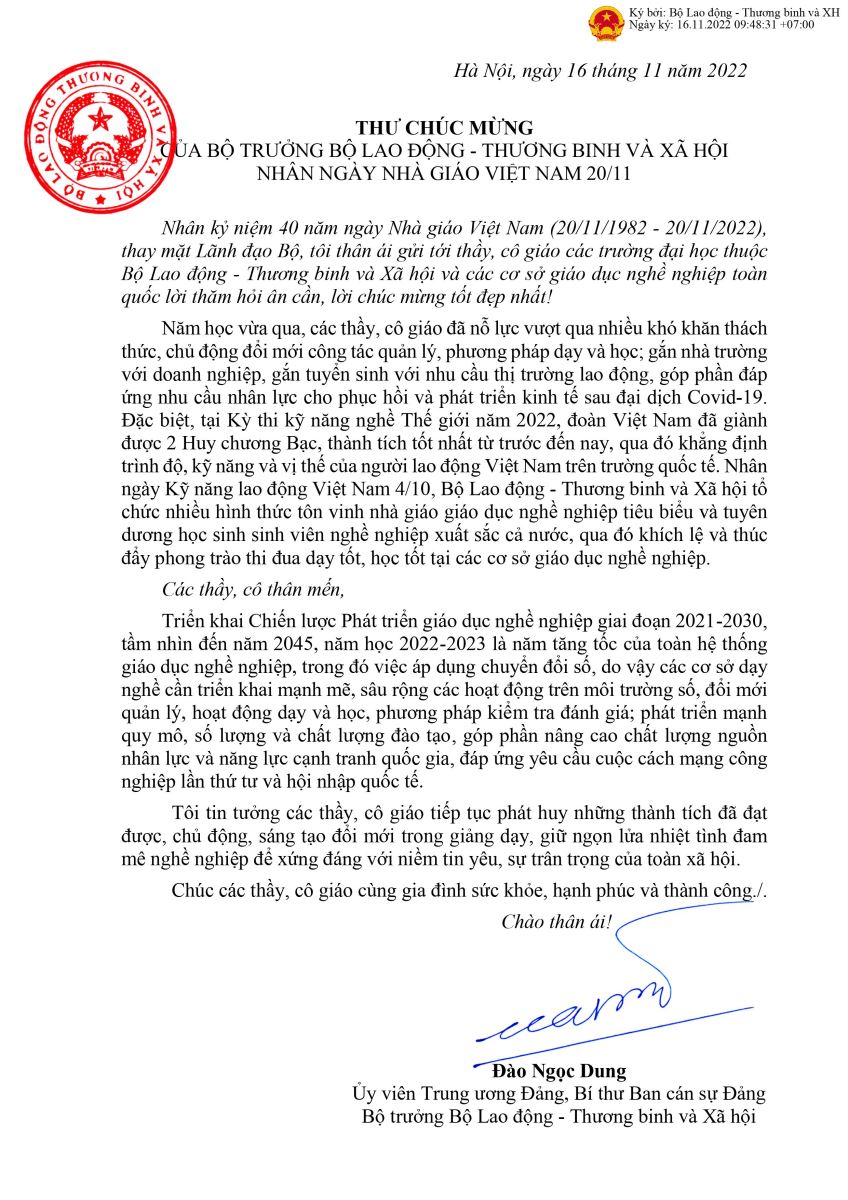 Thư Chúc mừng ngày Nhà giáo Việt Nam của Bộ trưởng Bộ Lao động Thường binh và Xã hội
