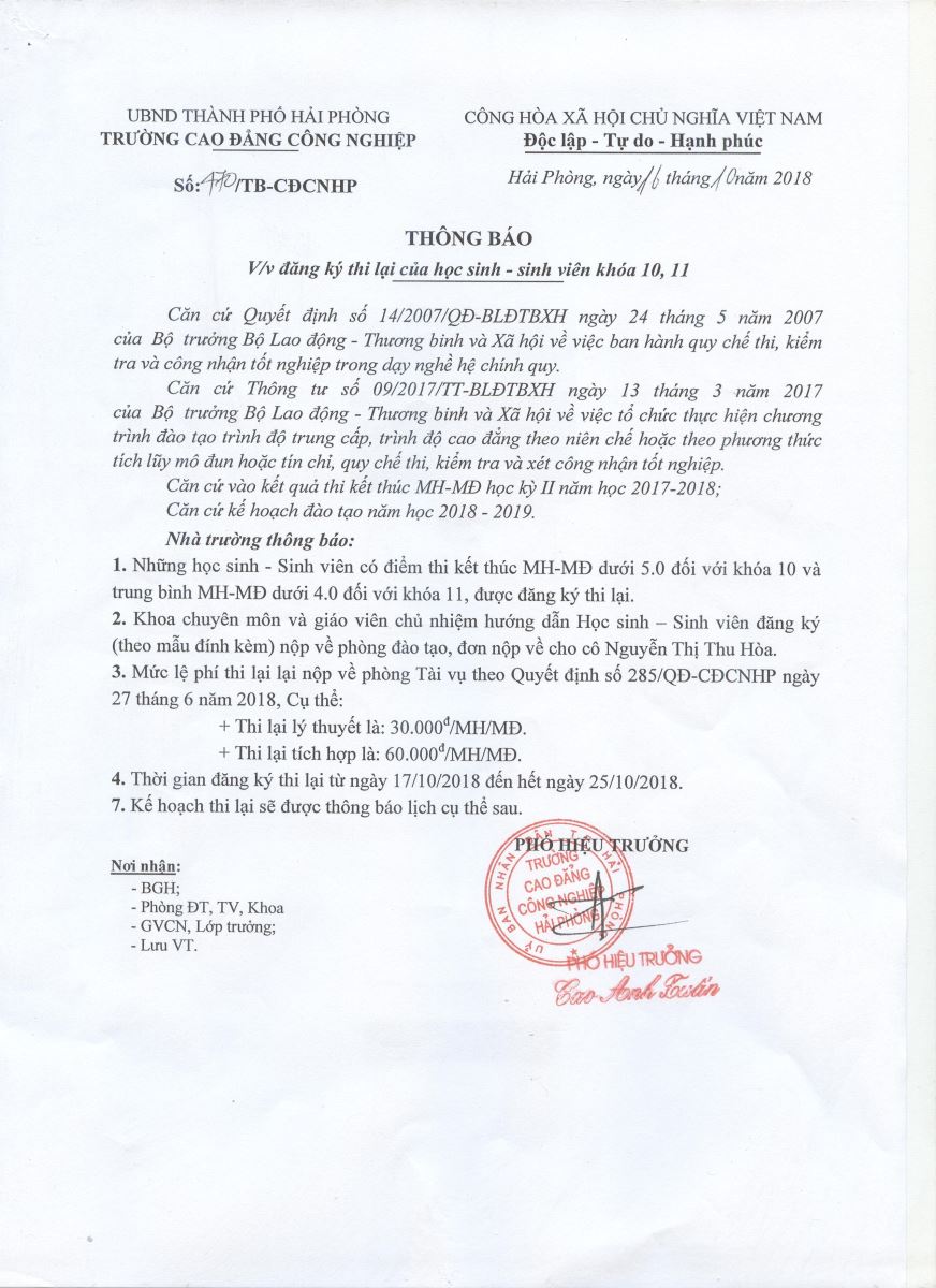 Thông báo thi lại Môn học - Mô đun đối với khóa 10 và 11