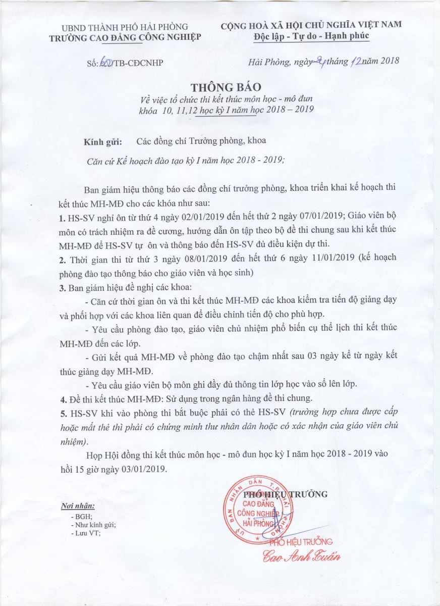 Thông báo thi kết thúc Môn học - Mô đun học kỳ I năm học 2018-2019